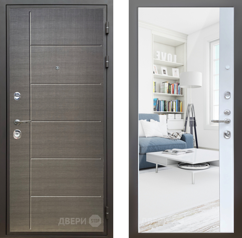Входная Дверь Шелтер (SHELTER) Комфорт Лен сильвер 14 с зеркалом Белый матовый 860x2050 мм