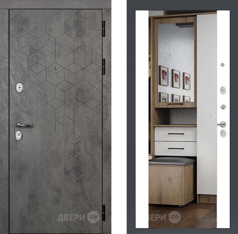 Входная металлическая Райтвер Бетон 1501 с зеркалом Белый матовый 860х2050 мм